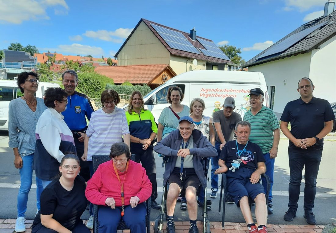 Bild mit allen Teilnehmern: 2. v.l.h.: Dirk Boss (Verkehrswacht Vogelsberg e.V.), 6. v.r.h.: Kerstin Seibert (Verkehrswacht Vogelsberg), 1. v.r.h.: Sascha Diederich (Einrichtungsleiter vom Haus am Michelsbach)