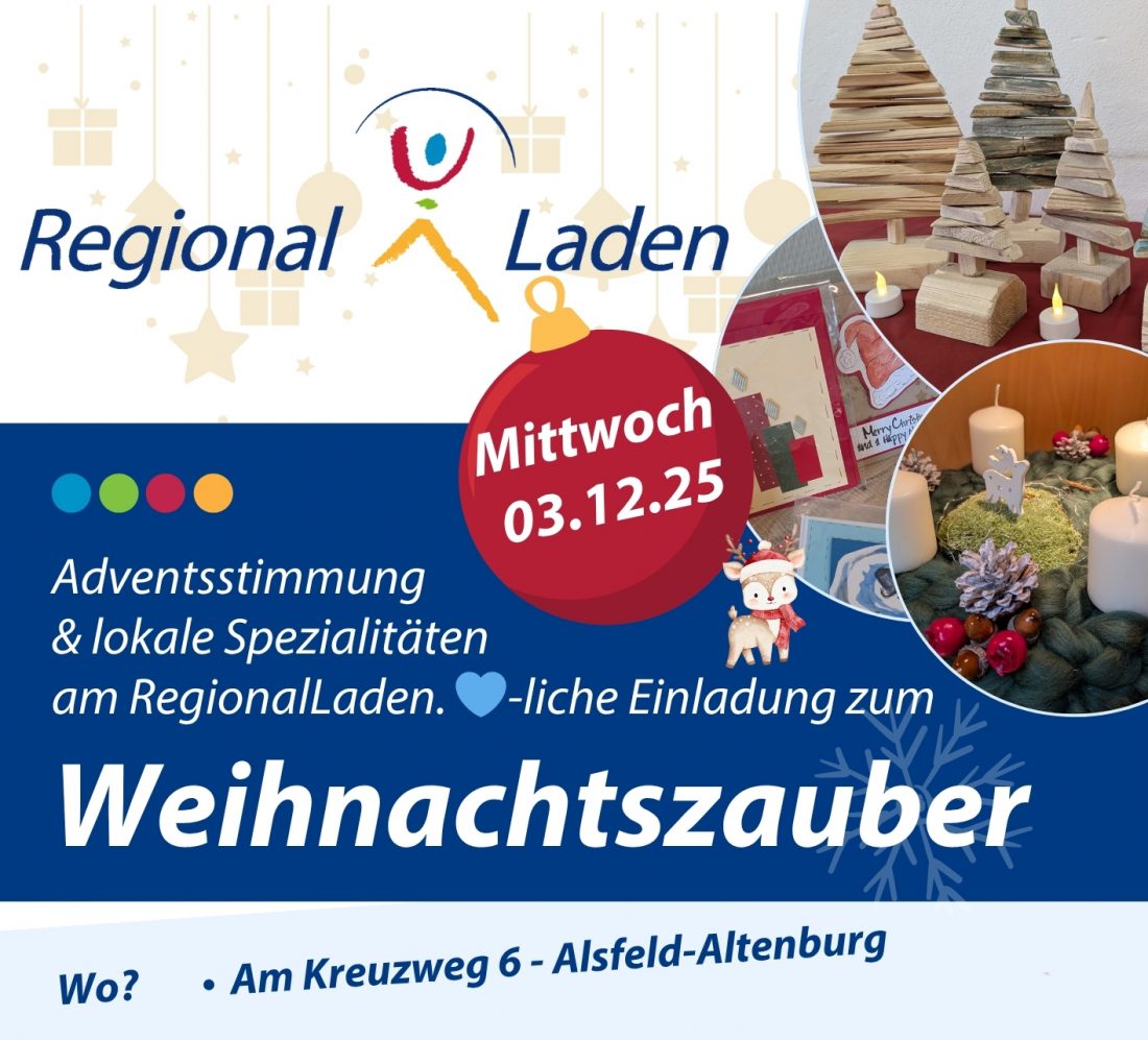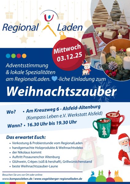 ALSFELD (pm) – Am Mittwoch, 3. Dezember 2025, lädt der Vogelsberger RegionalLaden gemeinsam mit der Werkstatt von Kompass Leben e.V. zum stimmungsvollen Weihnachtszauber ein. Von 16:30 bis 19:30 Uhr erwartet die Gäste am Kreuzweg 6 in Alsfeld-Altenburg ein festliches Programm voller Adventsstimmung, regionaler Spezialitäten und liebevoll handgemachter Weihnachtsdekoration.