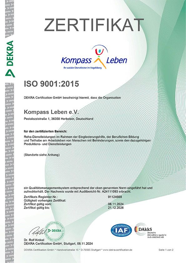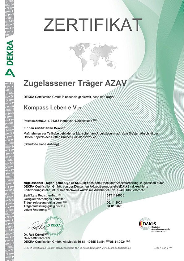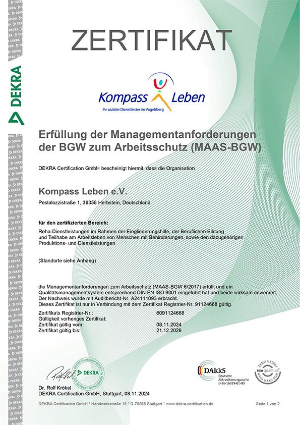 Bei Kompass Leben e.V. steht Qualität an erster Stelle. Unsere Arbeit orientiert sich an klaren Standards und wird regelmäßig extern geprüft. Die Zertifikate nach AZAV, ISO 9001:2015 sowie die Auszeichnung durch die Berufsgenossenschaft für Gesundheitsdienst und Wohlfahrtspflege (BGW) bestätigen unser Engagement für professionelle Strukturen, kontinuierliche Verbesserung und ein sicheres, gesundes Arbeitsumfeld. Auf dieser Seite finden Sie eine Übersicht unserer aktuellen Zertifizierungen.