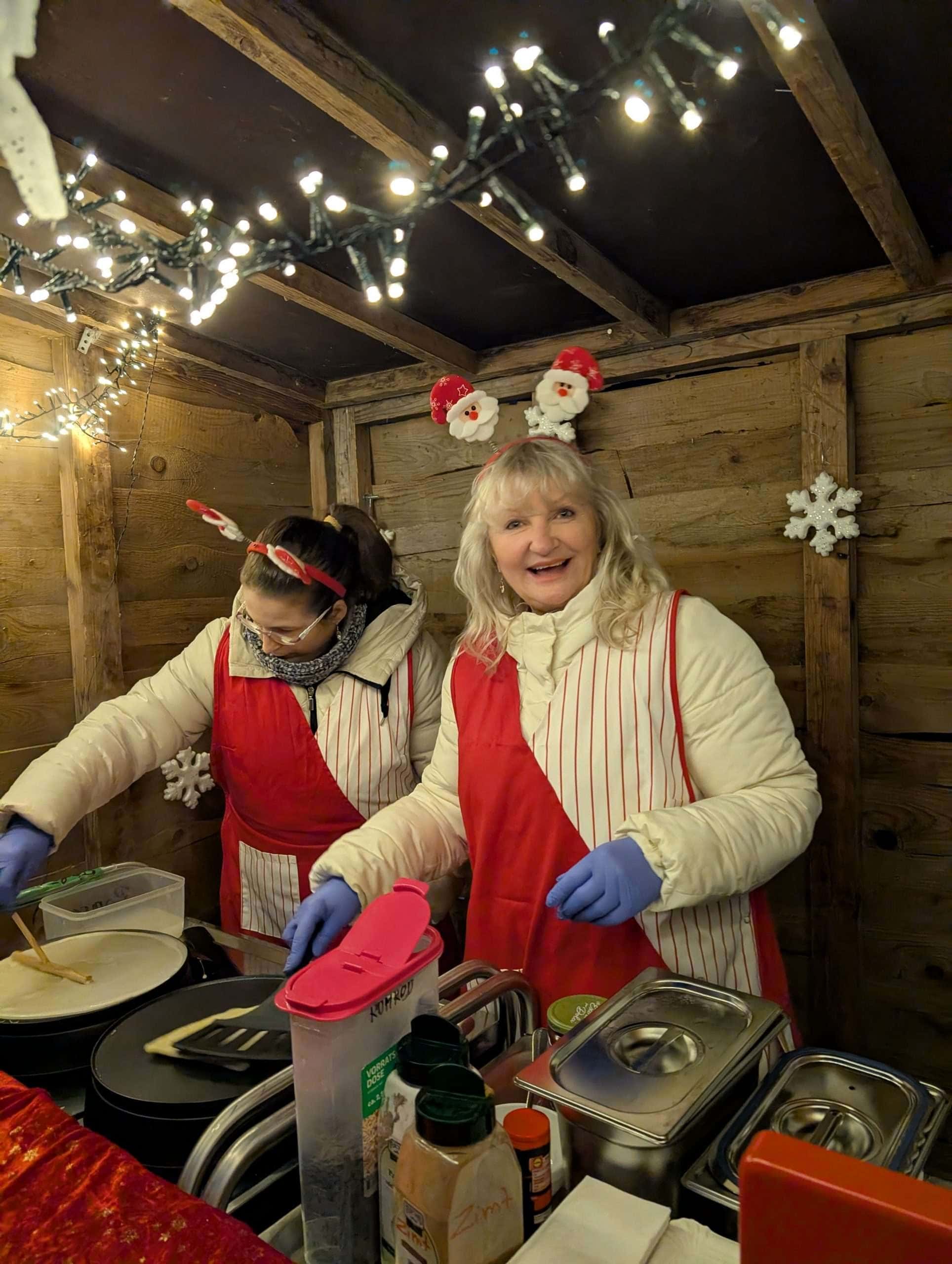 • am Crêpes-Stand: Herzlicher Empfang am gemütlichen Weihnachtsstand: Zwei Beschäftigte vom Team Kompass Leben e.V. bereiten frische Crêpes zu.